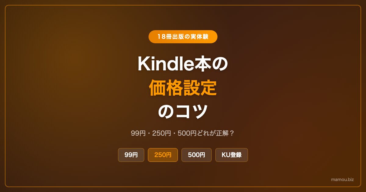 この記事では、Kindle本を18冊出版してきた筆者が、99円・250円・500円それぞれの価格帯の特徴と、ジャンル別の最適価格を実体験をもとに解説します。